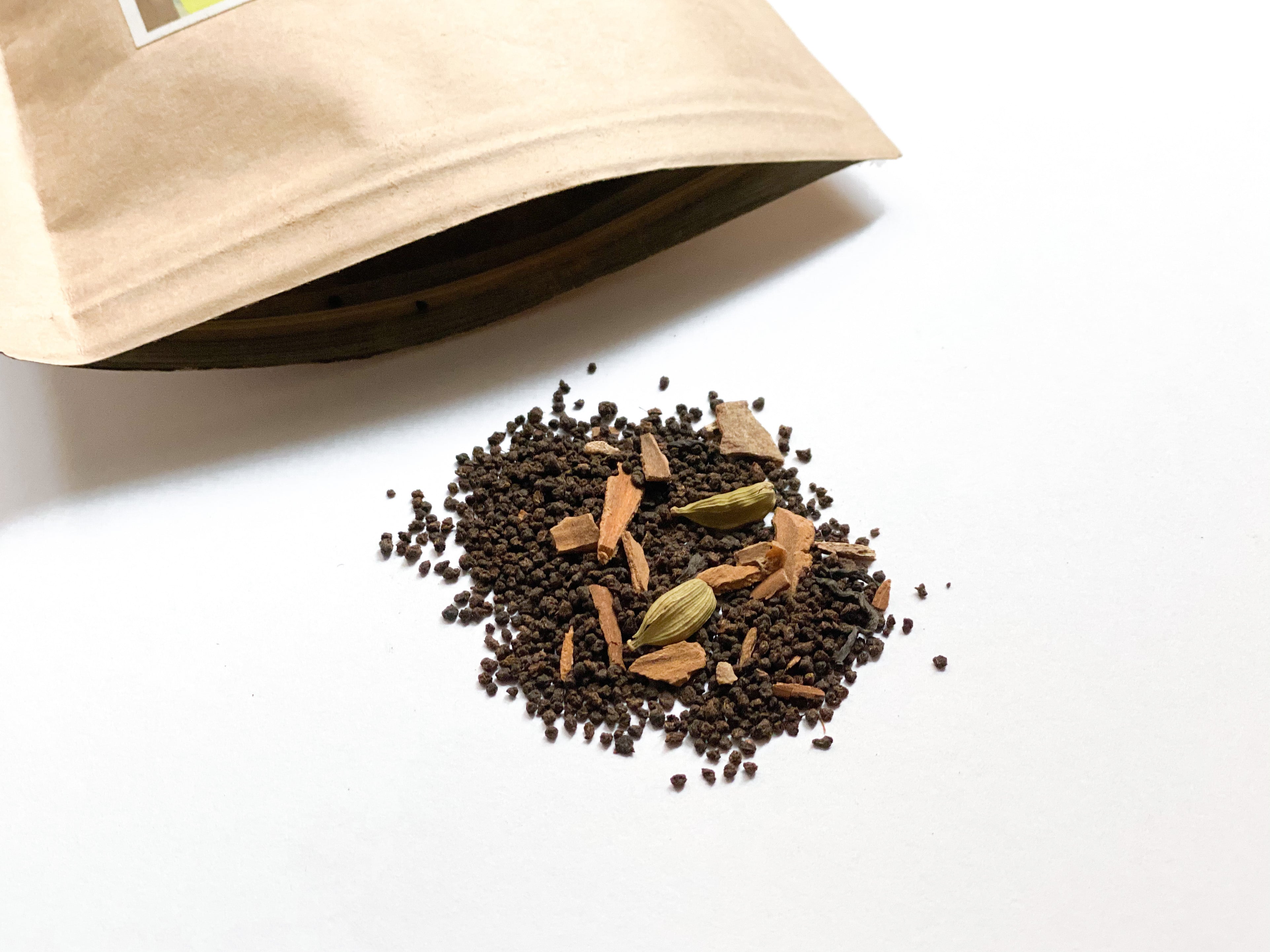 原材料:アッサムCTC、シナモンパウダー、ジンジャーパウダー、カルダモンパウダー、クローブパウダー、シナモンスティック、カルダモンホール、クローブホール